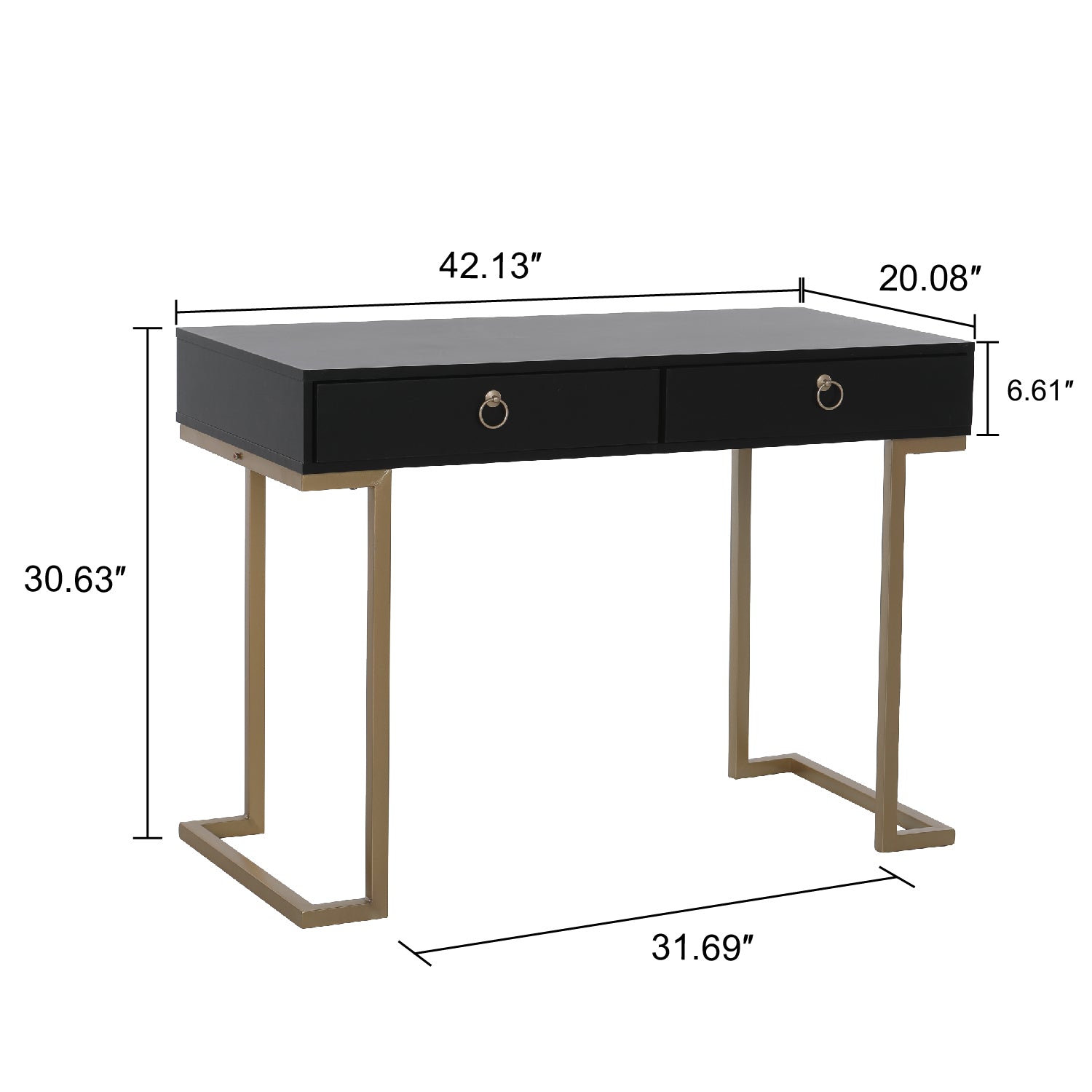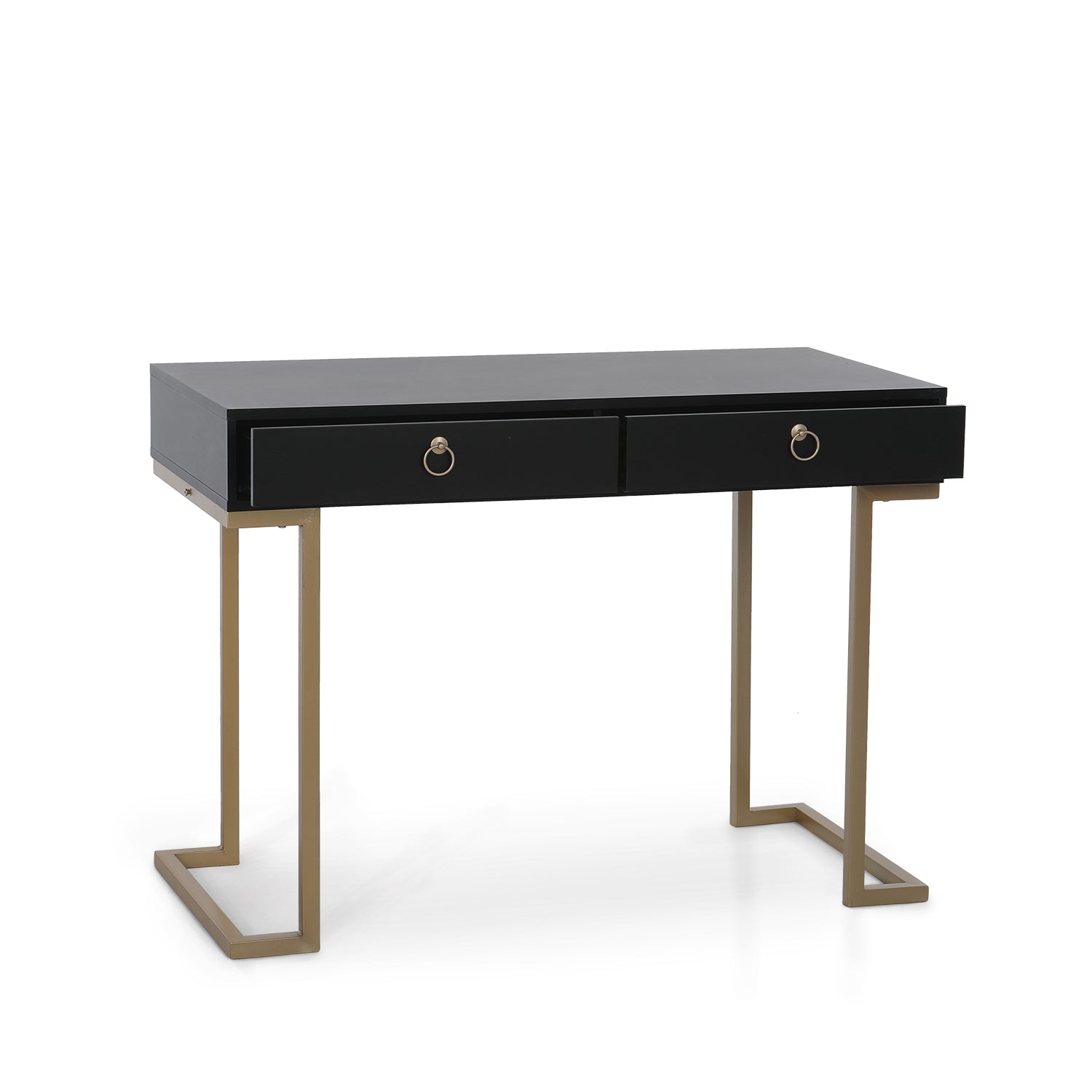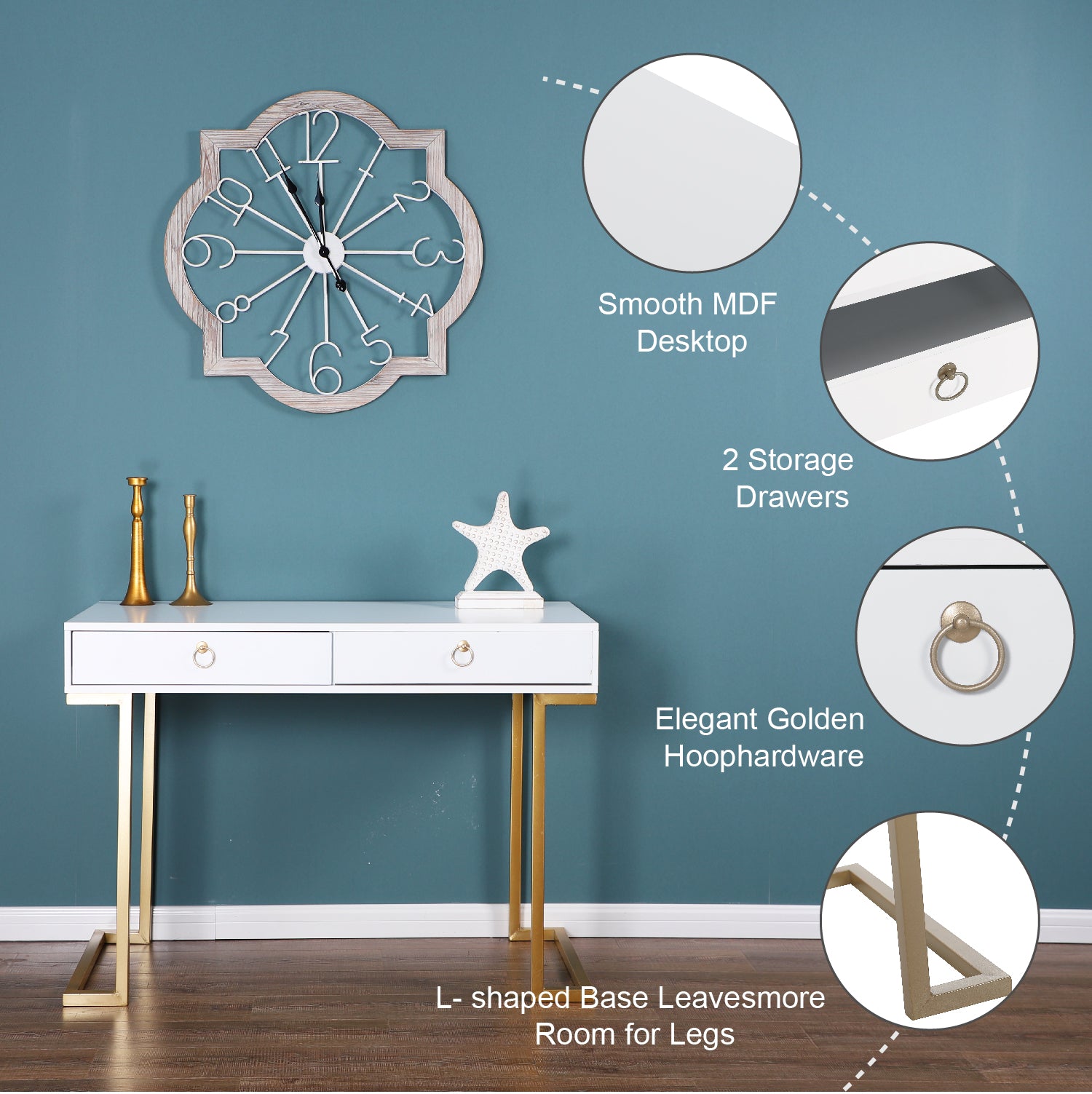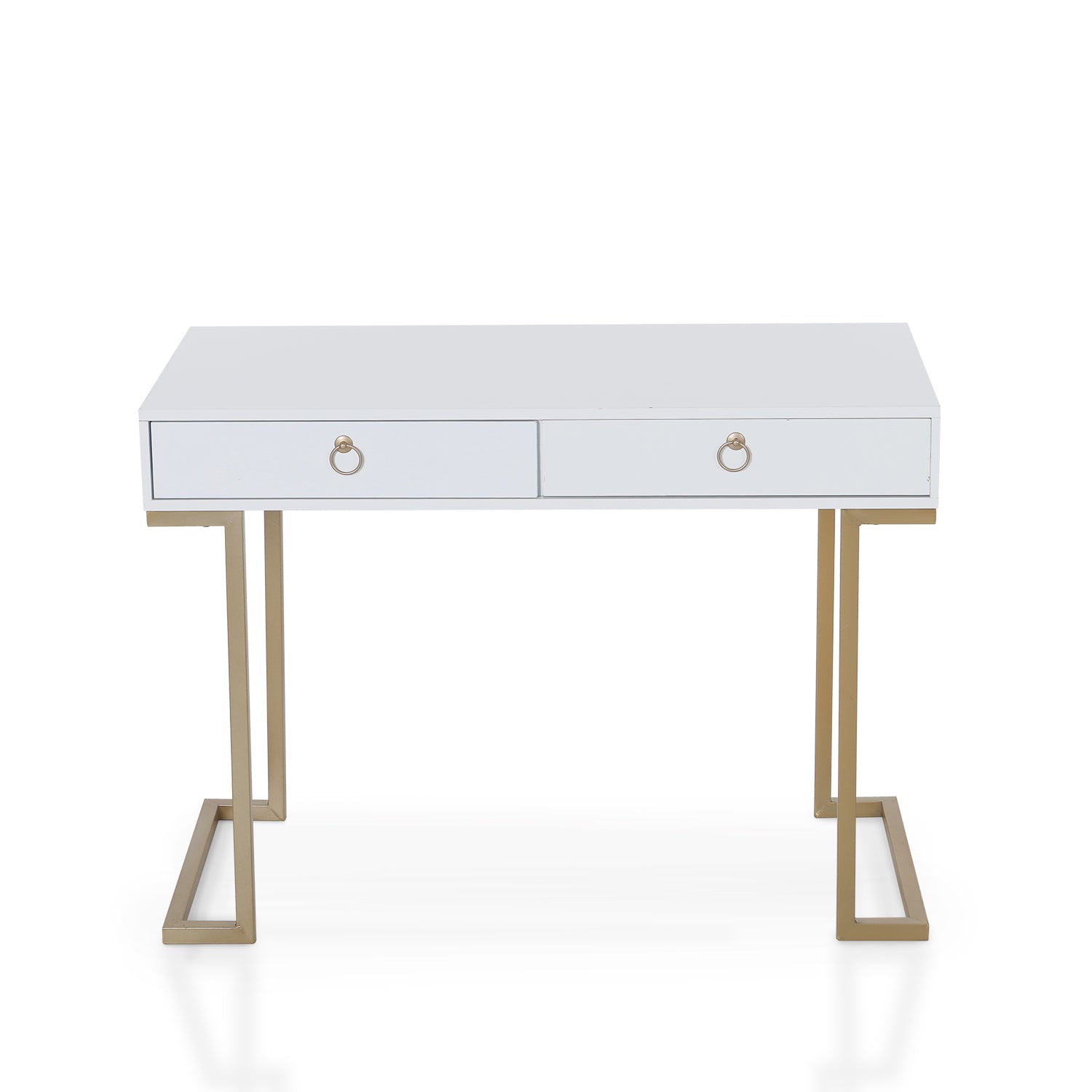 Modern Design: The Desk has a sleek wooden surface with two drawers supported by a strong metal base.Gold-painted frame adds a touch of luxury to this sophisticated table.L-shaped stand design gives more room for your legs.