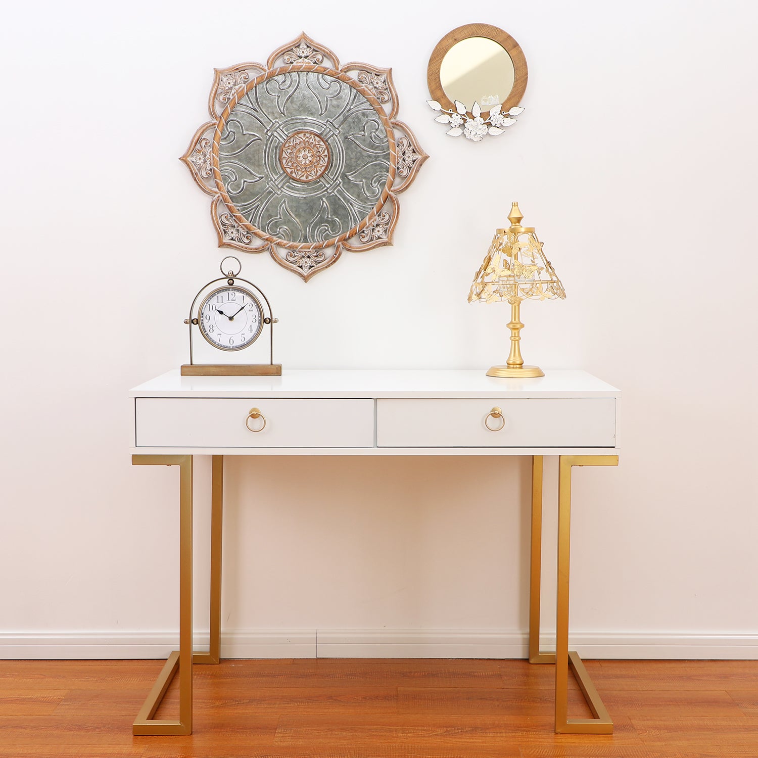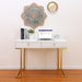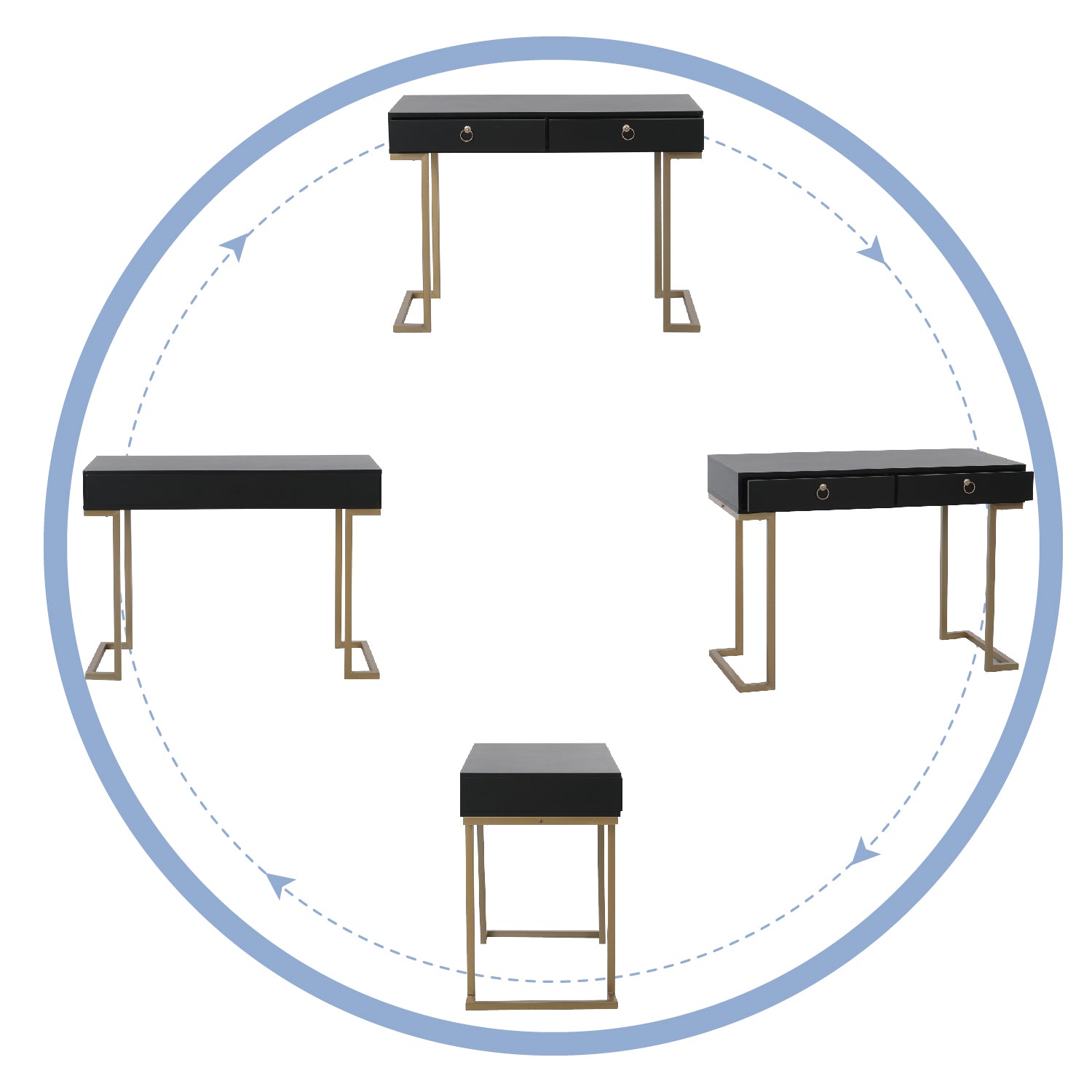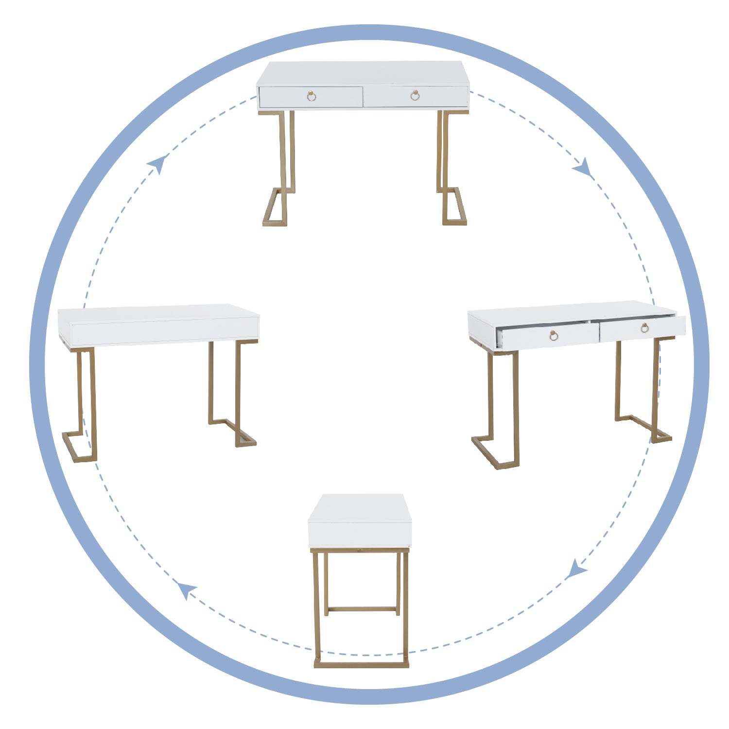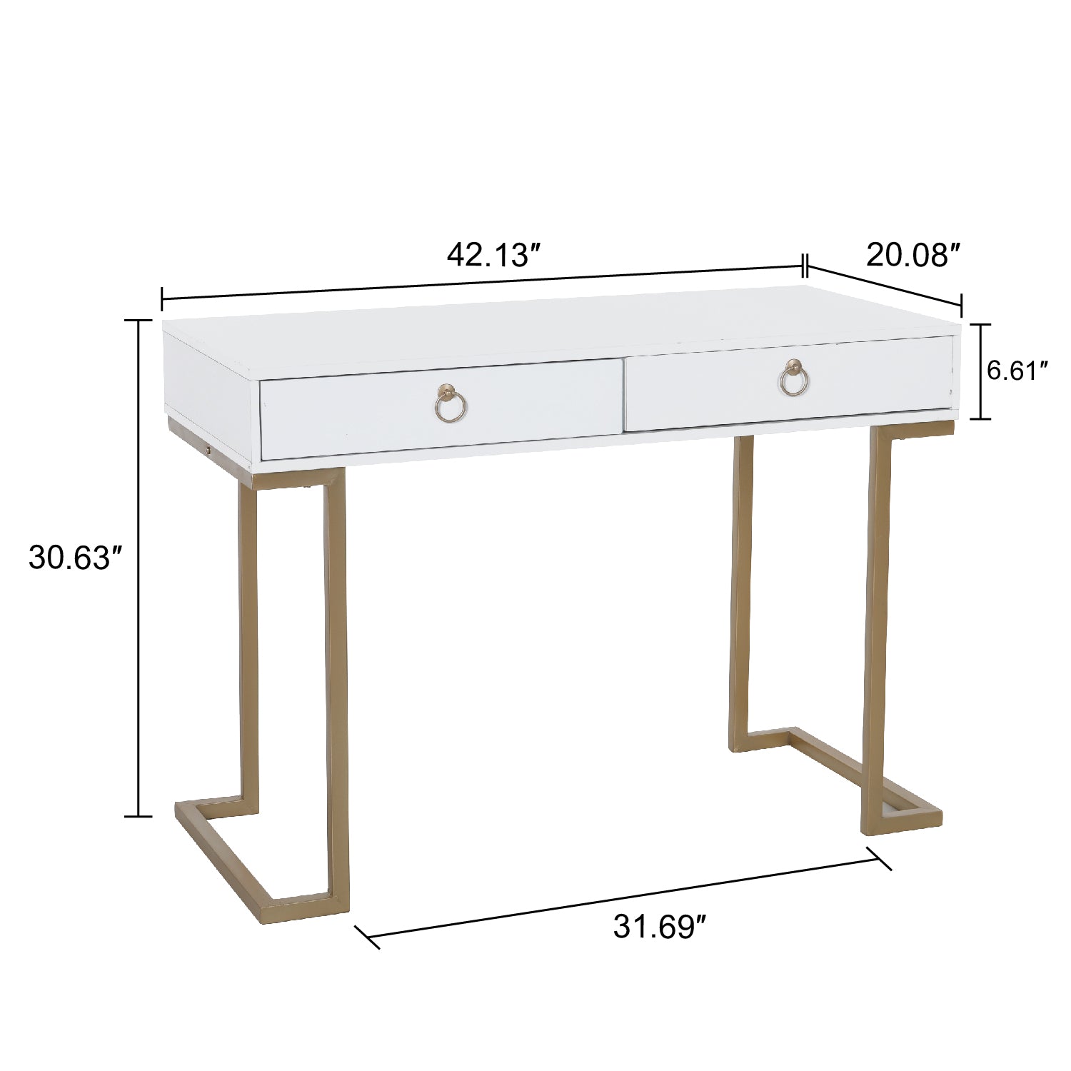 Modern Design: The Desk has a sleek wooden surface with two drawers supported by a strong metal base.Gold-painted frame adds a touch of luxury to this sophisticated table.L-shaped stand design gives more room for your legs.